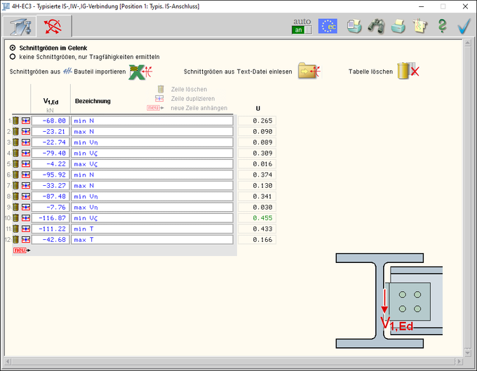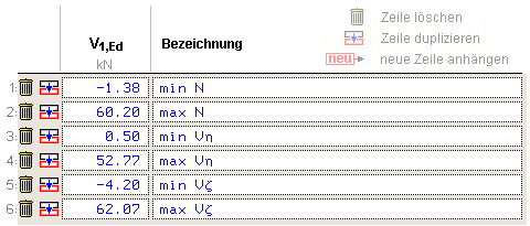Maske zur Eingabe der Bemessungsschnittgrößen (inkl. der