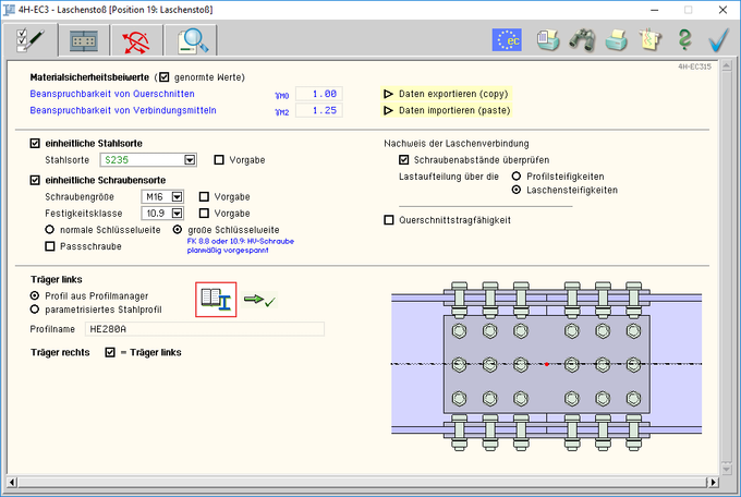 Das Programm 4H-EC3LS, Laschenstoß, weist einen Laschenanschluss für typisierte Doppel-T-Profile oder