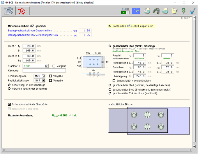 Das Programm 4H-EC3NV, Normalkraftverbindung, weist für ausgewählte Anschlusskonfigurationen die zentrische Normalkraftbeanspruchung entspr. Eurocode 3 nach.