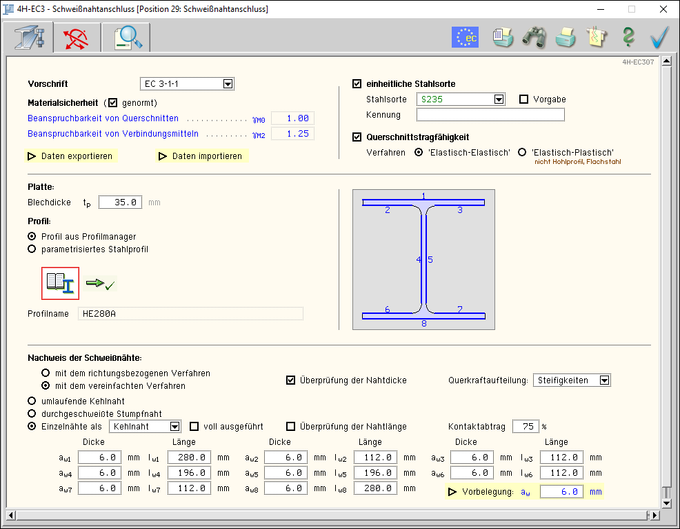 Das Programm 4H-EC3SA, Schweißnahtanschluss, führt den Schweißnahtnachweis für beliebige typisierte Profile unter zweiachsiger Beanspruchung nach Eurocode 3 (DIN EN 1993-1-8) und DIN 18800 (z.B. für Nachrechnungen).