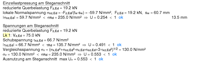 | Der Vergleichsspannungsnachweis enthält hier nur Anteile aus Querlast- und Schubspannung im Steg. |