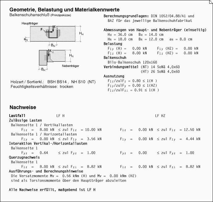 Dieser Abschnitt zeigt das Eingabefenster für den Bauteiltyp Balkenschuh und das fertig gesetzte Ergebnisprotokoll