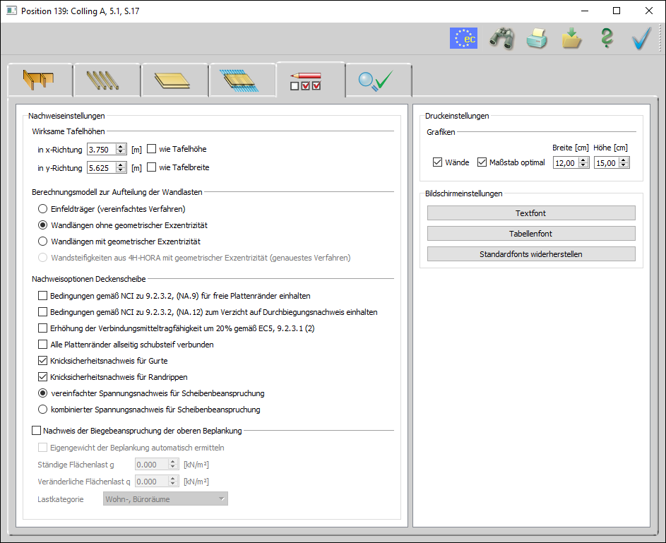 -HDTF, Deckentafel, Programmeinstellungen und Nachweisoptionen