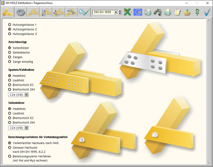 Das Programm 4H-HKBA, Kehlbalkenanschlüsse, dient zur Berechnung von K. entsprechend den Holzbaunormen