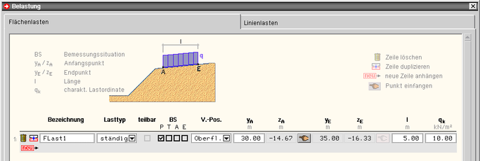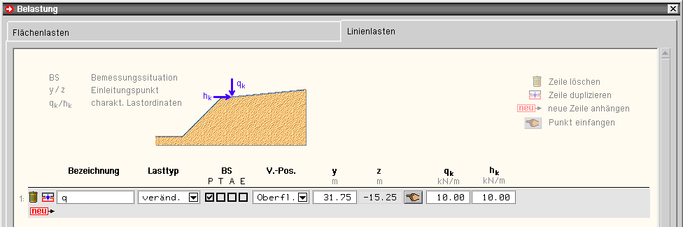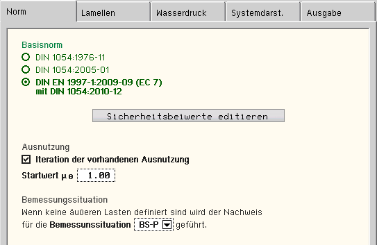 | Sollten keine äußeren Lasten (s. Belastung) definiert sein, ist hier die Bemessungssituation vorzugeben, für die der Nachweis nur infolge der Bodensituation zu führen ist. |