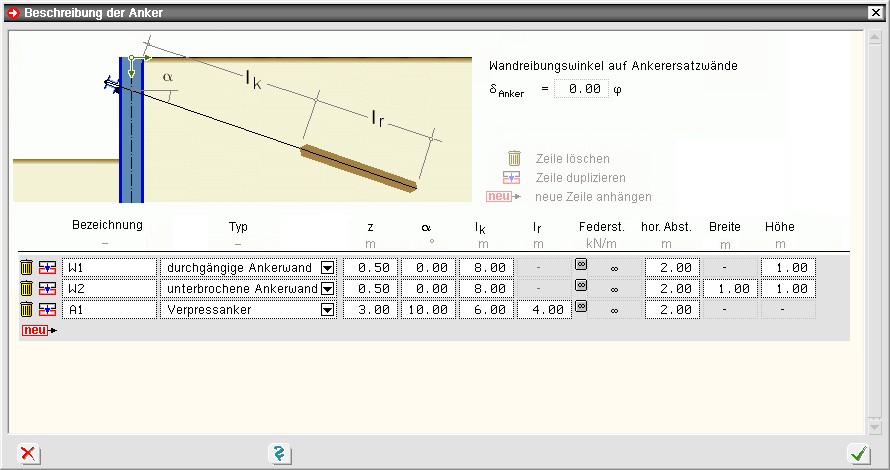 -GRUBE, Spund-/Trägerbohlwand, Eingabeoberfläche - Beschreibung der Anker