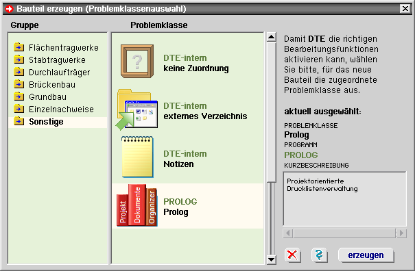 Über die DTE®-Funktion Bauteil erzeugen erscheint die Problemklassenauswahl. In der Gruppe Sonstige