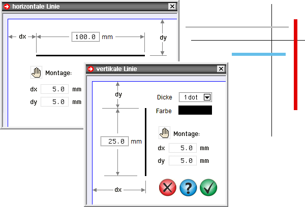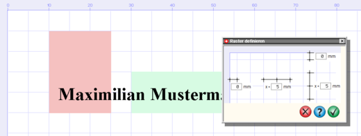 Der oberste Button dient der Definition des Rasters hinsichtlich der horizontalen und vertikalen Linienabstände. Der zweite Button schaltet das Raster ein, der dritte wieder aus.
