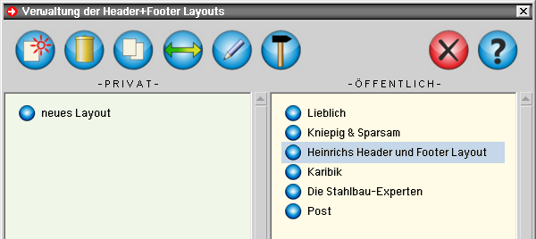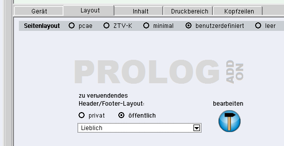Mit den nebenstehenden Schaltflächen kann das Ergebnis eines gestalteten Header/Footer-Layouts überprüft werden.