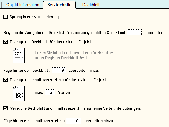 Im Register Setztechnik werden dem aktuellen Bauteil setztechnische Angaben zugeordnet. Hier können an bestimmten Stellen Leerseiten eingefügt, ein Deckblatt und/oder ein Inhaltsverzeichnis angeordnet und auf die automatische Nummerierung Einfluss genommen werden.