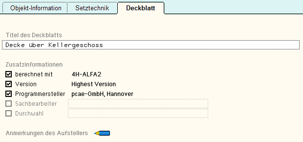 Im Register Deckblatt kann das Deckblatt gestaltet werden. Hier werden zunächst der Titel und ggf. Zusatzinformationen festgelegt. Darüber hinaus können hier Anmerkungen des Aufstellers eingefügt werden.