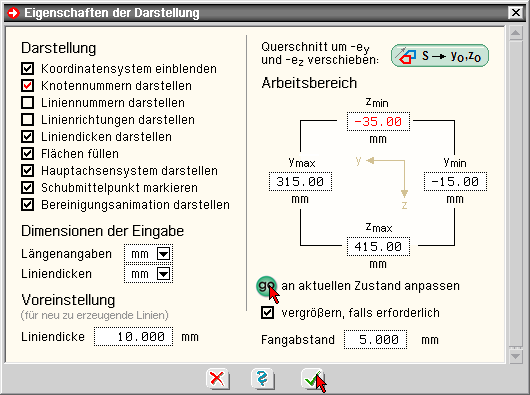 des Eigenschaftsblatts (grüner Haken) erscheint der Querschnitt in voller Größe im Konstruktionsfenster. |