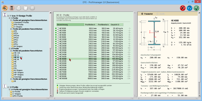 im linken Fenster die Profilfamilie HE-B. Durch Anklicken werden alle Profile dieser Reihe im mittleren