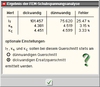 | Zu erkennen ist, dass die genauere dickwandige FE-Berechnung ein um ca. 25% höheres Torsionsträg-heitsmoment liefert. |