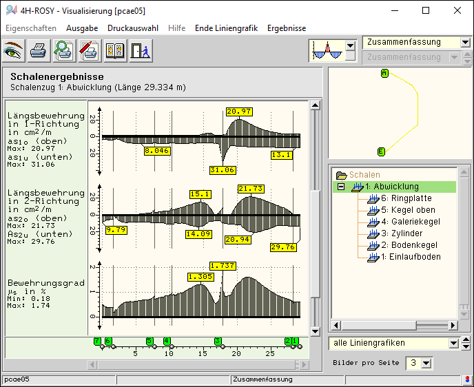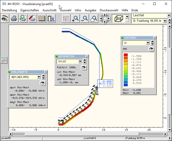 Grafiken können als Deformationsbilder, Konturflächendarstellungen, Zahlengrafiken und Grenzlinien am Gesamtsystem erstellt werden. Die Ausgabeformen können